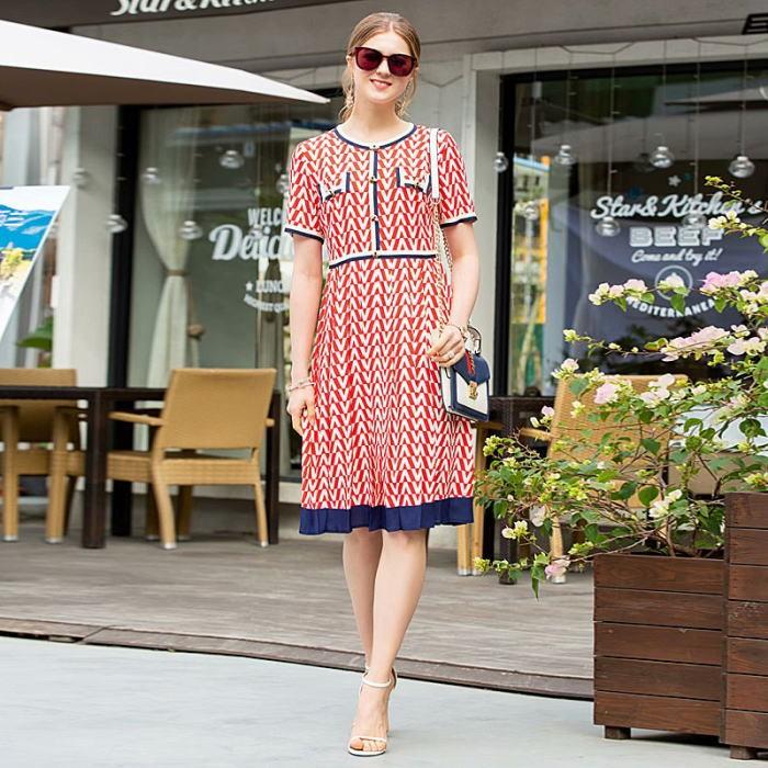 公式 ワンピース 柄物 トリコロールカラー リボン 蜂ボタン プリーツ 半袖 Aライン 膝丈ワンピース 送料無料 安い Rajasthankiran Com